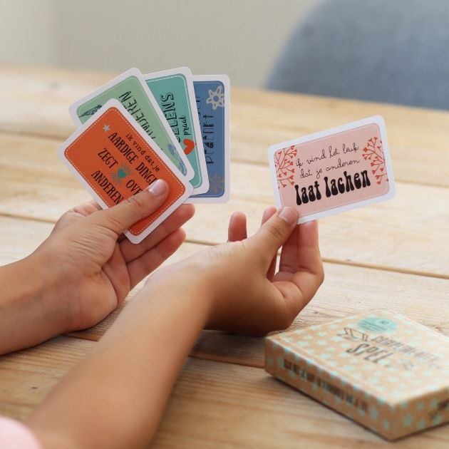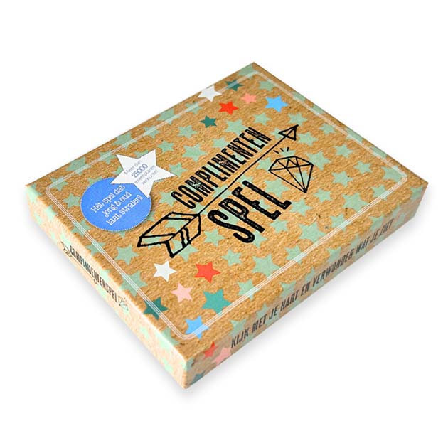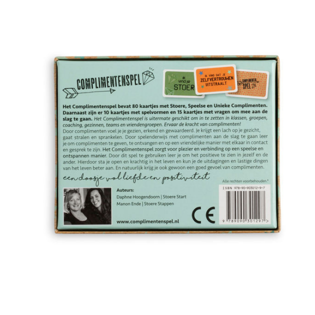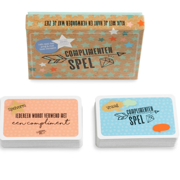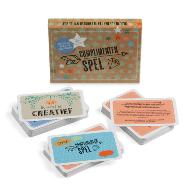 VERNIEUWD - Het Complimentenspel is er voor iedereen die dol is op positiviteit en een (glim)lach! Het is gemakkelijk te gebruiken door groot en klein, kinderen én volwassenen beleven veel plezier met het Complimentenspel. Of dit nu thuis, op school, op het werk of met vrienden is; het Complimentenspel kun je overal mee naartoe nemen en zorgt bij iedereen voor een positief effect. Leven vanuit je passies, talenten en het gevoel van vertrouwen in jezelf en anderen is het mooiste wat er is. En natuurlijk krijg je ook gewoon een goed gevoel van complimenten.