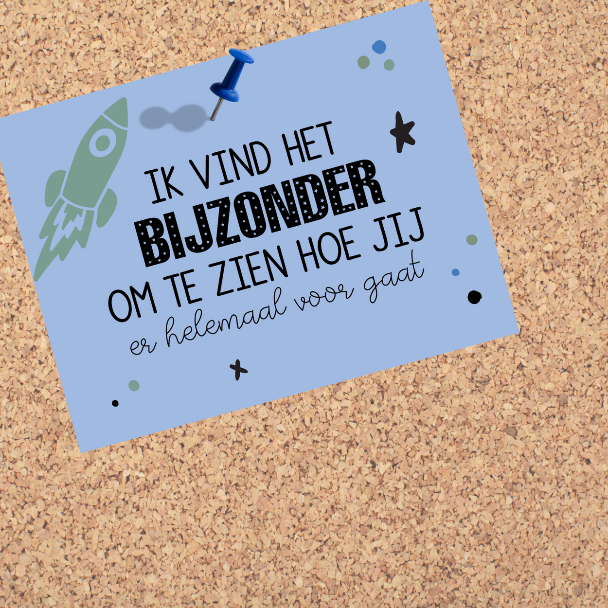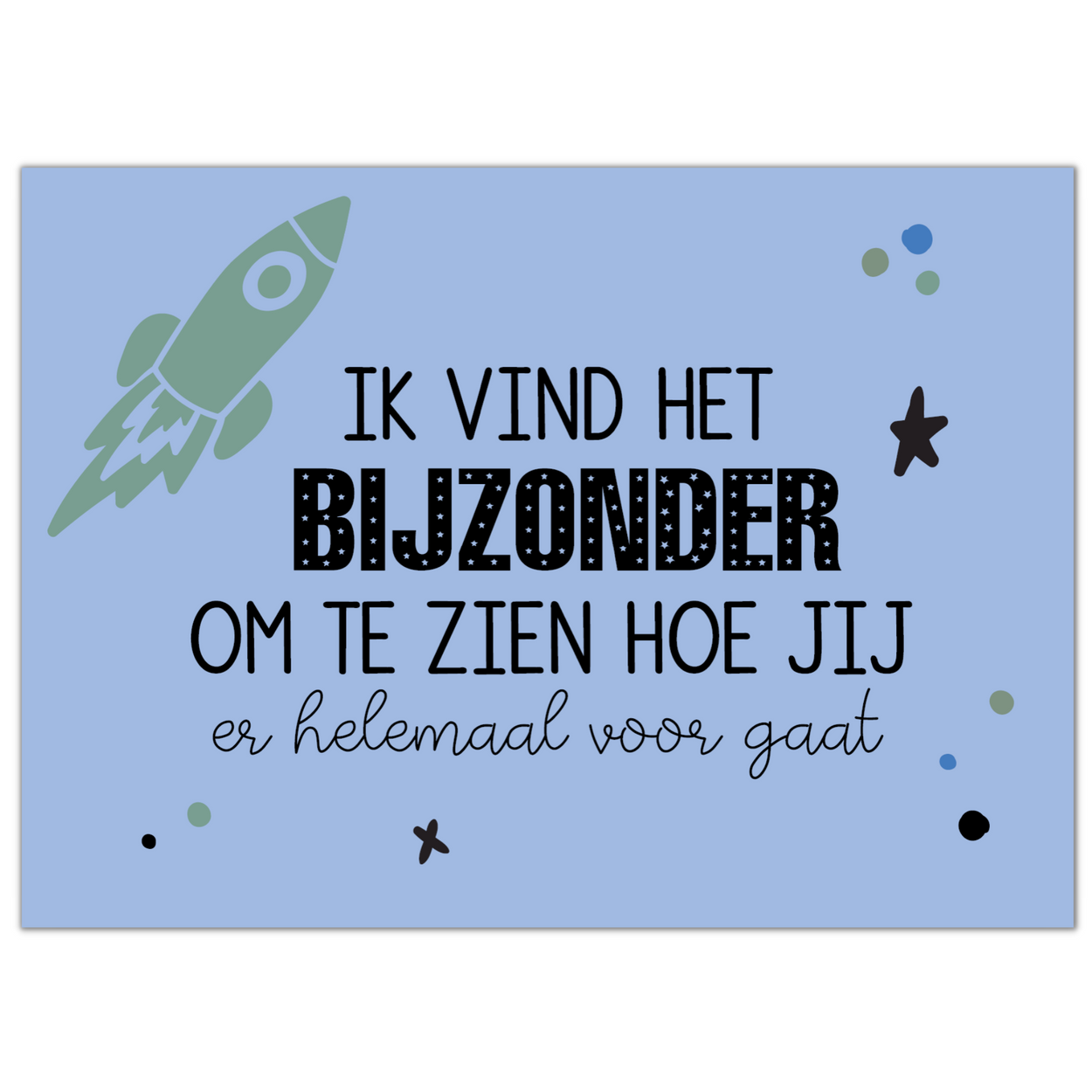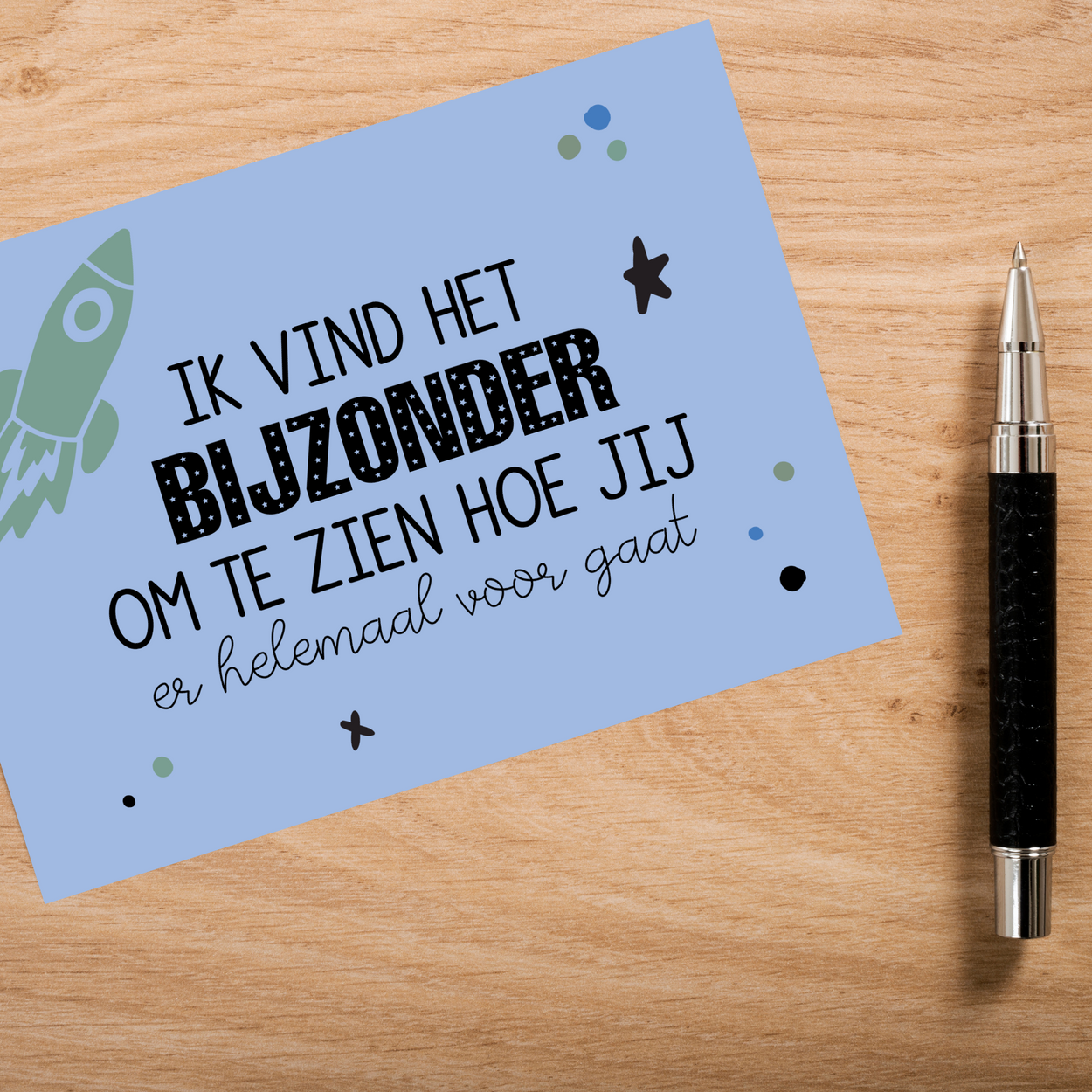 Ansichtkaart met de tekst "Ik vind het bijzonder om te zien hoe jij er helemaal voor gaat"