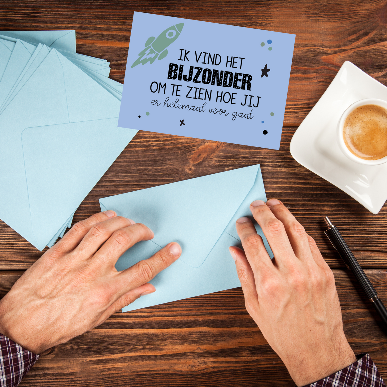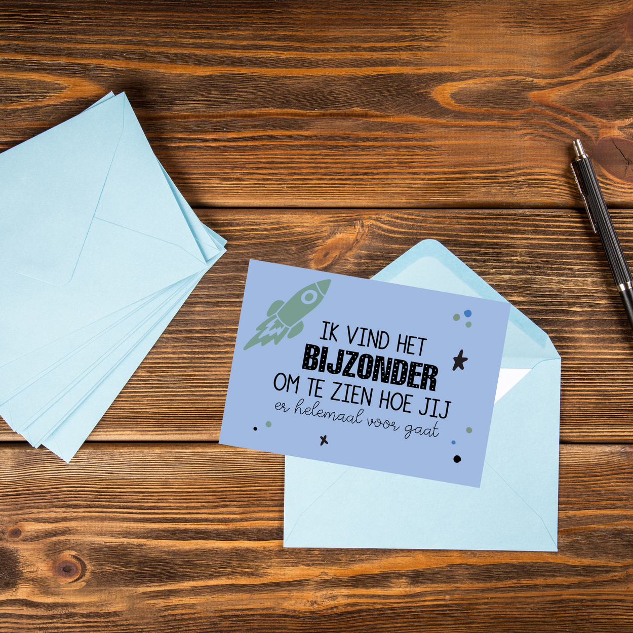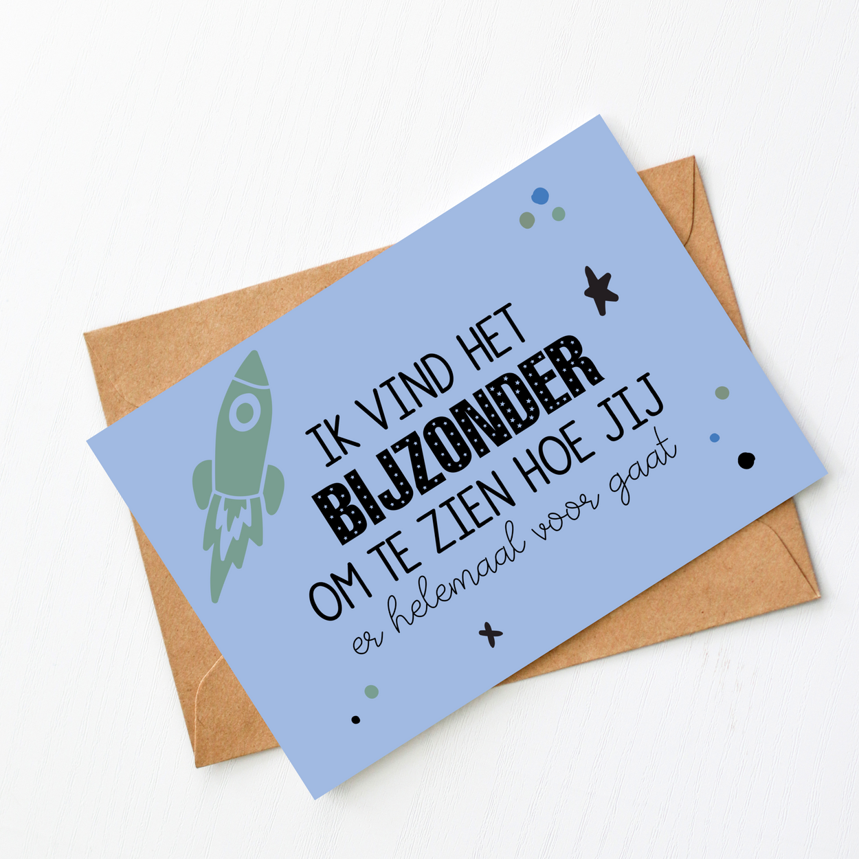 Ansichtkaart met de tekst "Ik vind het bijzonder om te zien hoe jij er helemaal voor gaat"
