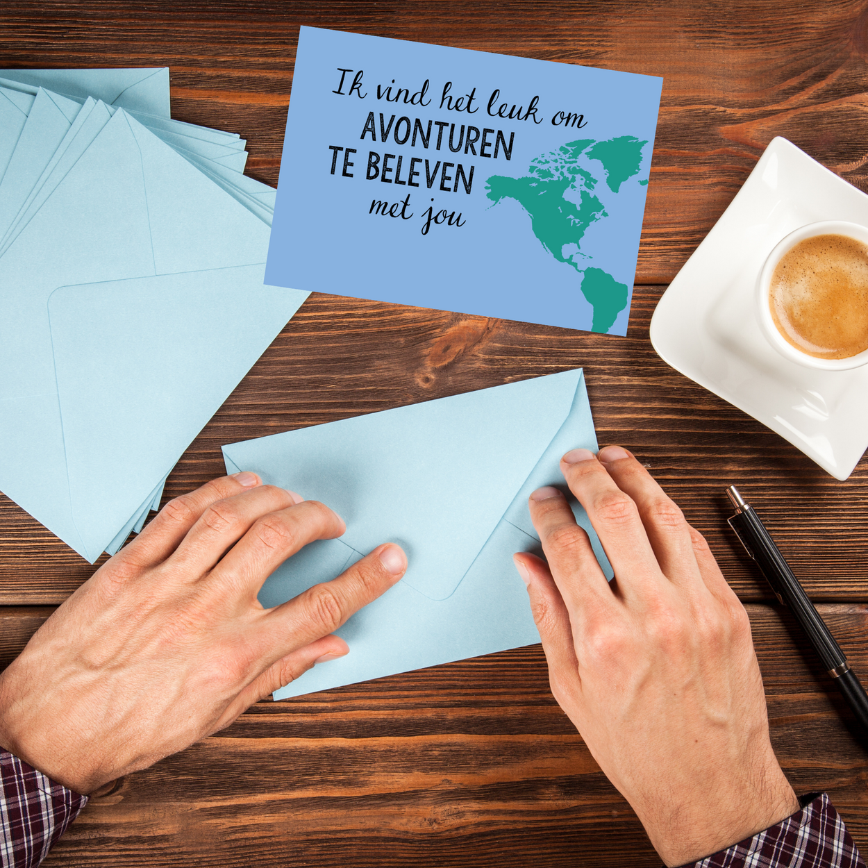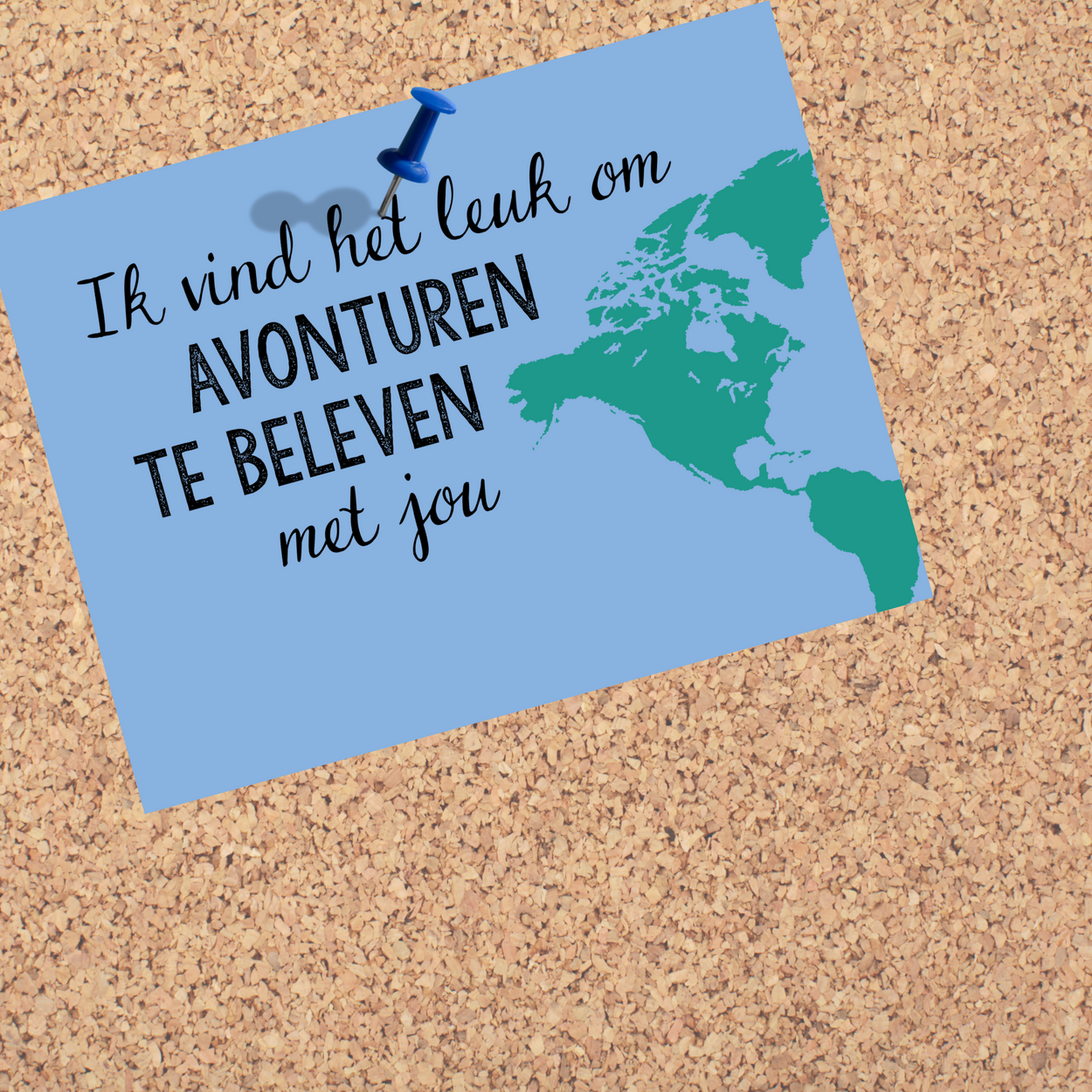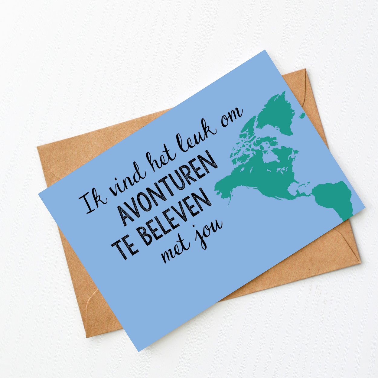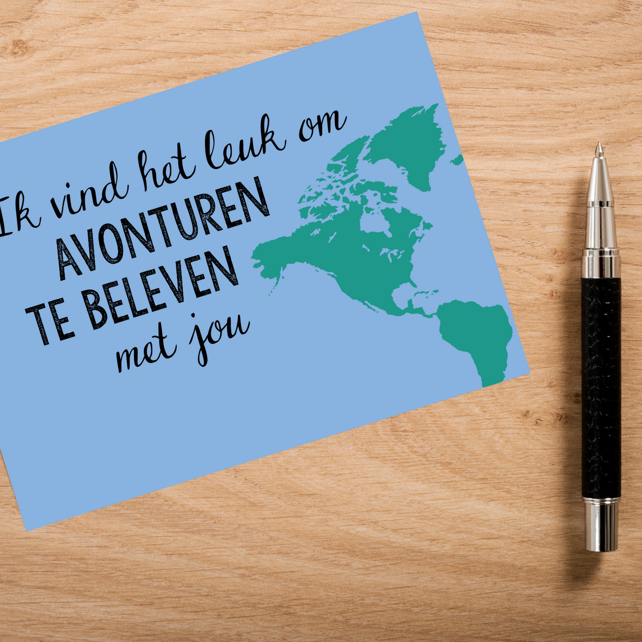 Ansichtkaart met de tekst "Ik vind het leuk om avonturen te beleven met jou"