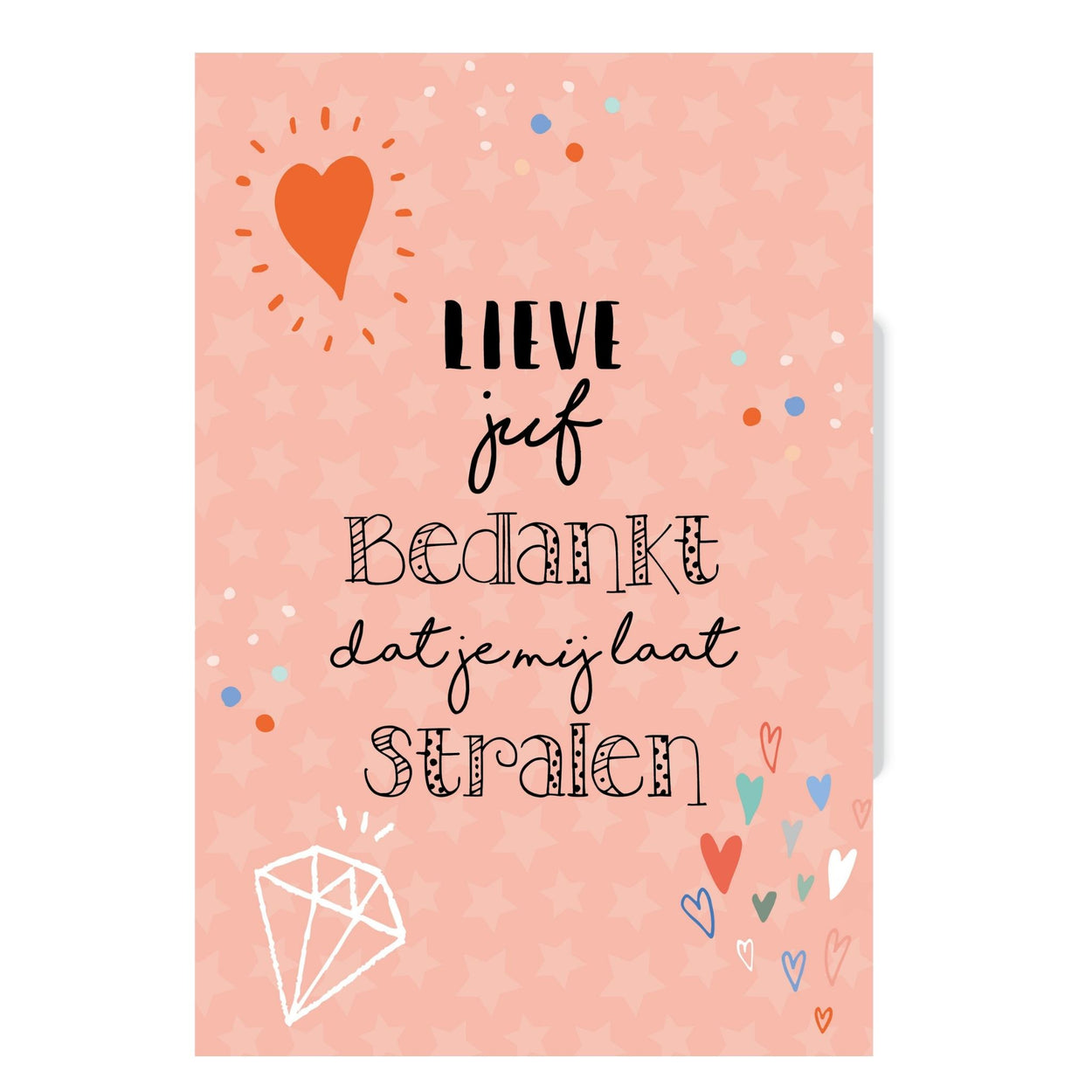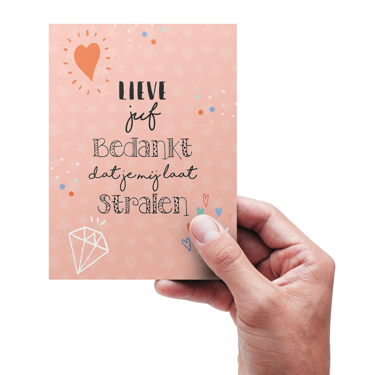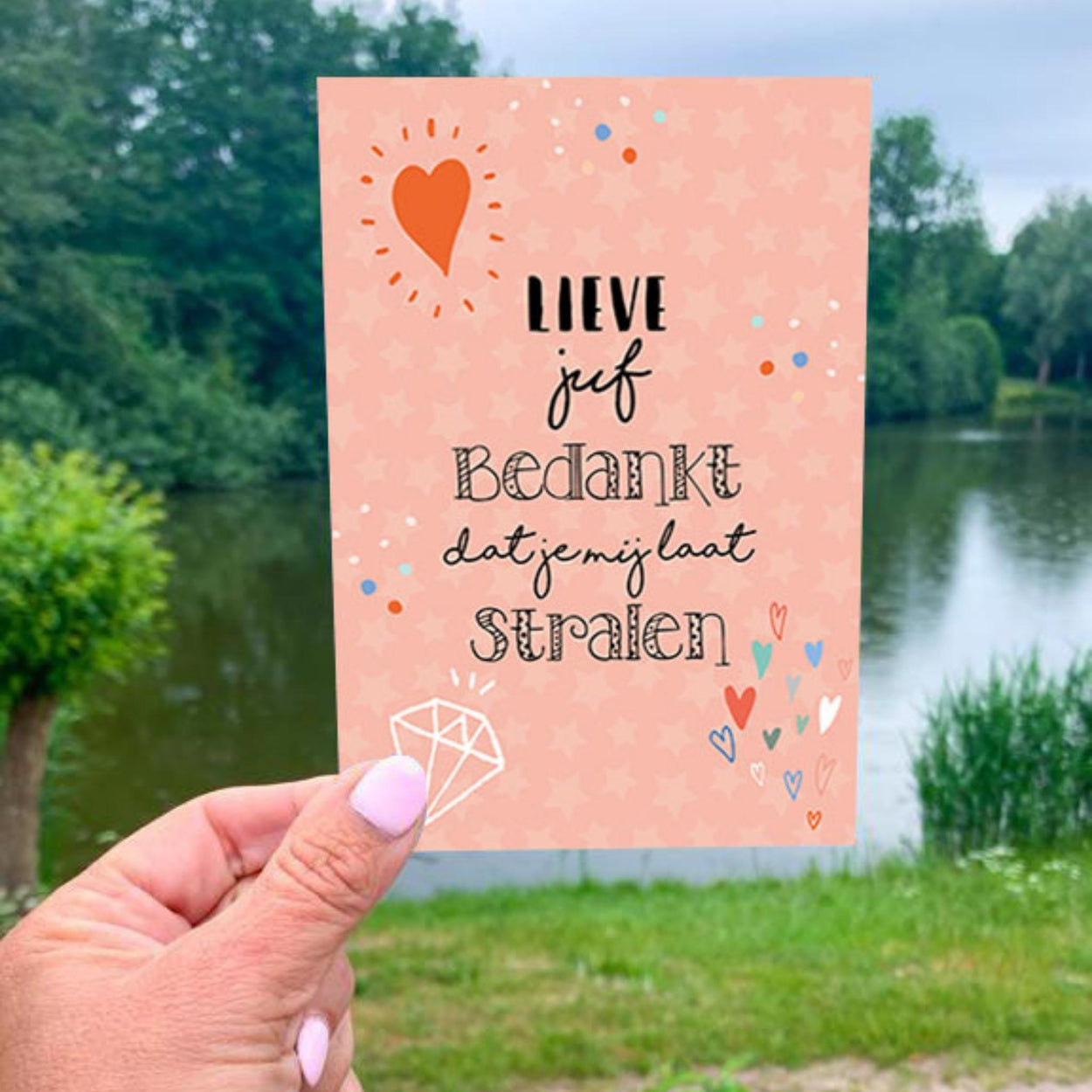 Ansichtkaart met de tekst "Lieve juf, bedankt dat je mij laat stralen"