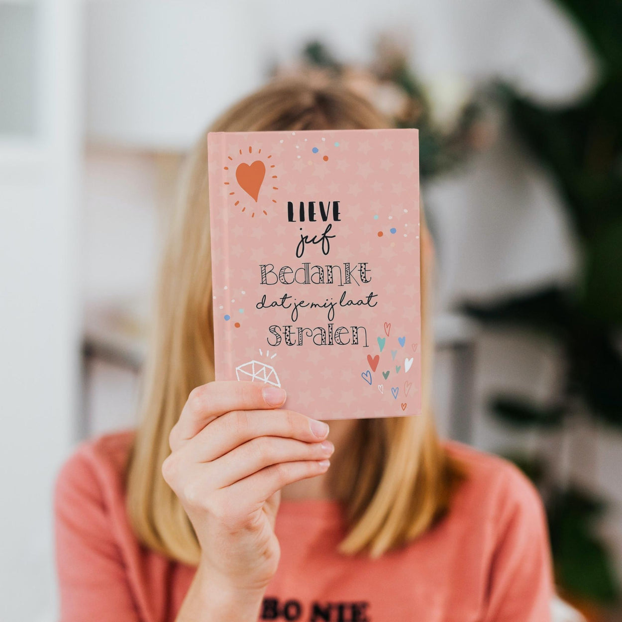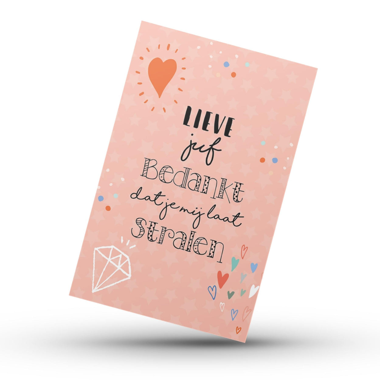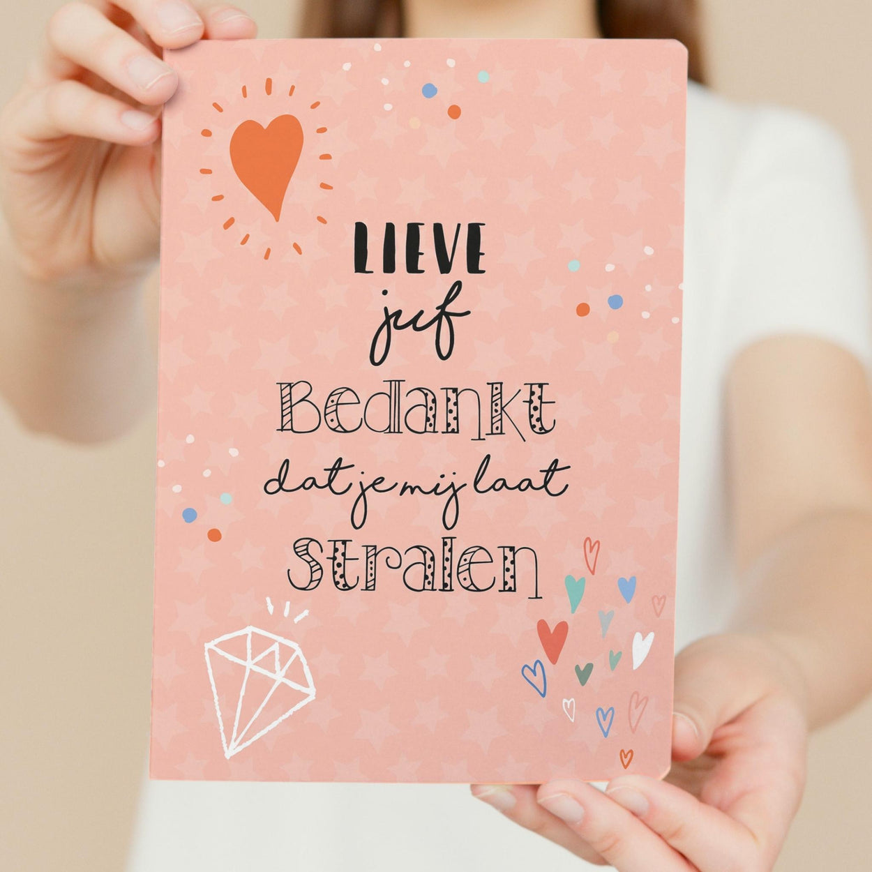 Ansichtkaart met de tekst "Lieve juf, bedankt dat je mij laat stralen"