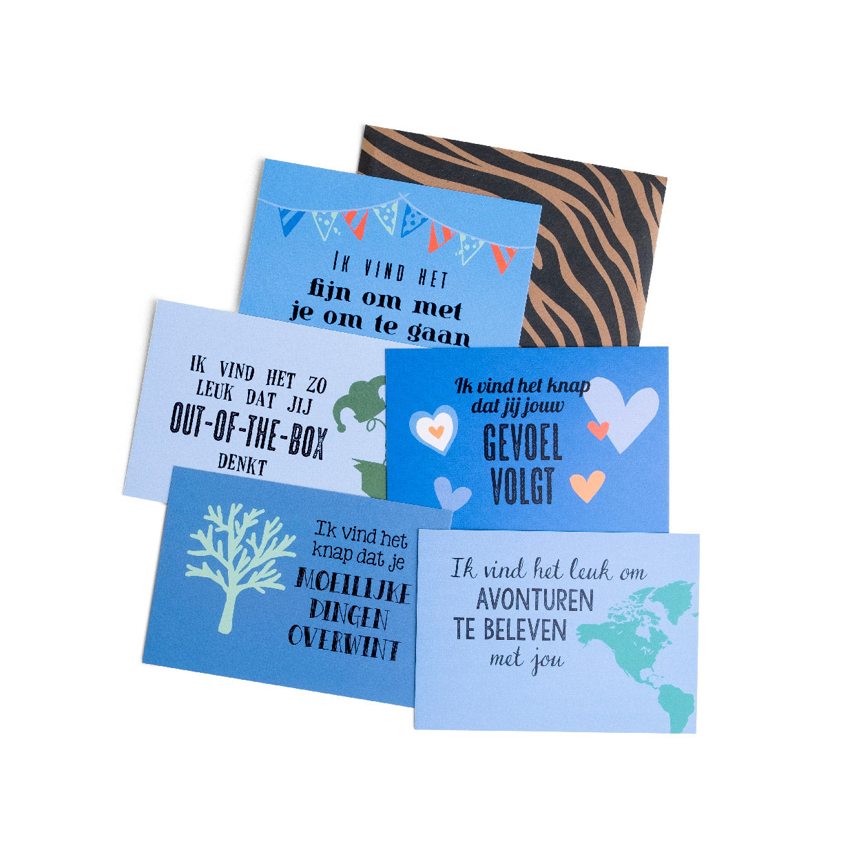 Keer op keer is het een feestje om te werken met complimenten. Deze vijf ansichtkaarten komen uit het Complimentenspel. Wij houden van de persoonlijke aandacht, de woorden van waardering en erkenning. Deze ansichtkaarten zijn zo leuk om op willekeurige momenten aan mensen te versturen. Een compliment in de brievenbus geeft je dag een gouden randje, toch?
