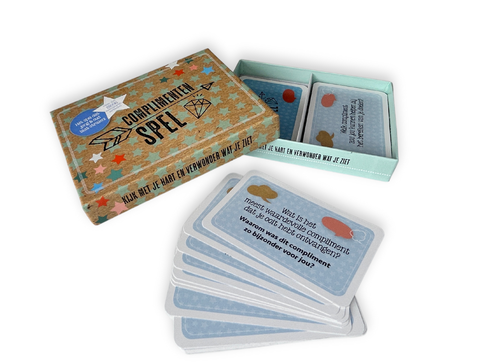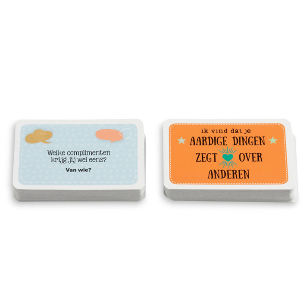 VERNIEUWD - Het Complimentenspel is uitermate geschikt om in te zetten met vrienden. Zowel met een hele vriendengroep, een bevriend stel of één op één zorgt het Complimentenspel voor positiviteit en plezier. De verschillende complimenten nodigen uit om op een positieve manier naar jezelf en elkaar te kijken. Hierdoor krijg je meer aandacht voor wat goed gaat en kunnen jullie makkelijker verwoorden wat je aan elkaar waardeert. Het spel zorgt voor een fijne, open sfeer en verrassend mooie gesprekken.