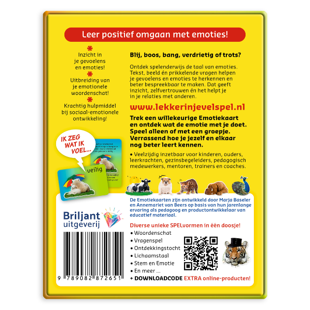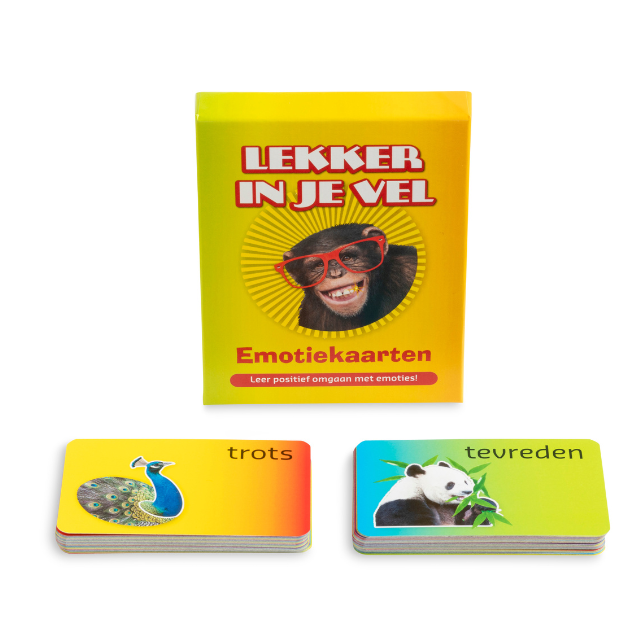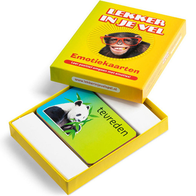 De EMOTIEkaarten van het Lekker in je Vel spel zijn een krachtig hulpmiddel om emoties beter te leren begrijpen, en om er een gesprek mee op gang te brengen. Tekst, beeld én prikkelende oplossingsgerichte vragen helpen gevoelens en emoties bespreekbaar te maken, ze te (h)erkennen en er beter mee om te gaan. Verrassend, hoe je jezelf en elkaar (nog) beter leert kennen. Je voelt je daardoor zekerder, het geeft je meer zelfvertrouwen én het helpt je in relaties met anderen.